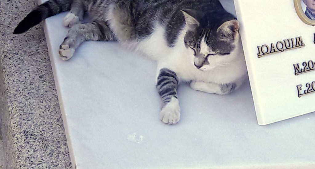 Lì sopra, sul piano di marmo, sdraiato a occhi socchiusi, sta un gatto grigio e bianco, a vegliare su quel morto come se fosse il suo morto. Questo quello che penserebbe senz’altro chi si trovasse a passare di lì. Forse si chinerebbe, allora, ad accogliere quella piccola testa nell’incavo della mano, per consolarla di una pena supposta, percorrerebbe con il palmo la linea morbida della sua schiena e pronuncerebbe una frase come: “Bravo micino”. La ripeterebbe due volte, forse: “Bravo micino, bravo micino”.