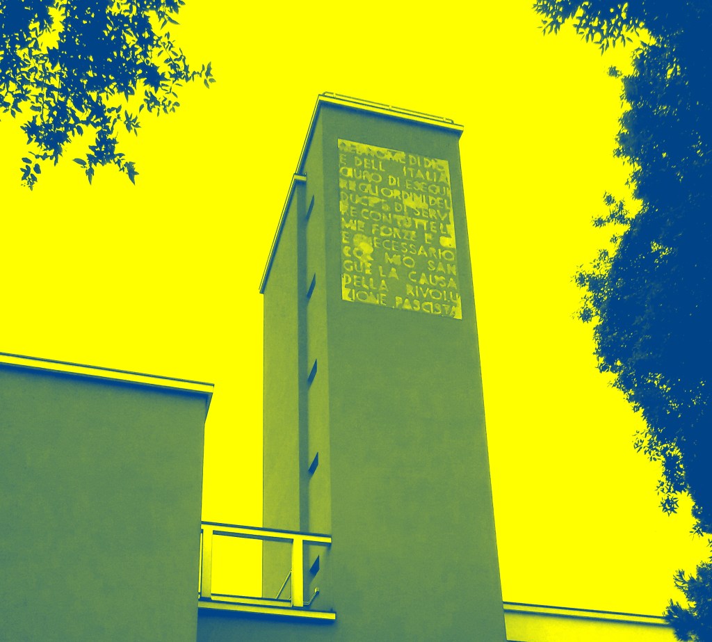 Poi c’è il palazzo. Il palazzo è rosso, dicevamo, ed è composto da una serie di pezzi che sembrano poggiati l’uno all’altro senza continuità, come in un goffo gioco di costruzioni fatto di parallelepipedi e strane forme arrotondate che da dentro sono stanze dalle pareti morbide, sulle quali non si possono attaccare quadri. In quel palazzo, una manciata d’anni fa, i giovani balilla, le camicie chiuse fino all’ultimo bottone, imparavano a ubbidire. Quando guardavano in alto, sulla torre che sorge al centro dell’edificio come un piccolo grattacielo che sarebbe incapace di toccare il cielo, se questo non gli venisse incontro, non vedevano quel che si vede ora. Vedevano delle lettere in rilievo che componevano una frase: ‘Nel nome di Dio e dell’Italia giuro di eseguire gli ordini del Duce e di servire con tutte le mie forze e se è necessario col mio sangue la causa della rivoluzione fascista’. Così dicevano.